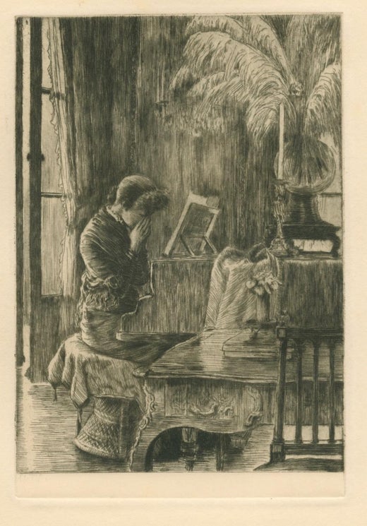 Tissot learned the rudiments of printmaking in the 1860s, greatly influenced by Whistler, whom he met in 1859, as well as Degas, Legros and Seymour Haden. Tissot's most productive period as an etcher was during his English period (1871-1882) when he was settled in London as a consequence of being branded a communard after the Franco-Prussian War. The subject-matter of Tissot's eighty-eight etchings often relates closely to that of his paintings, chronicling the elegant, leisured life of his epoch. Unlike the work of Whistler and Degas, for example, Tissot's etchings were always intended as accurate and finished transcriptions of his paintings rather than as experimental works in an alternative medium. As Michael Justin Wentworth, author of the catalogue raisonne of Tissot's prints, has written: "Tissot was conservative and always kept the finish expected at the Salon and the Academy…But in the iconography and the troubled psychology of his pictures he comes into his own". After the death of Tissot's London mistress and muse, Mrs Newton, the artist ceased to etch and returned to France.