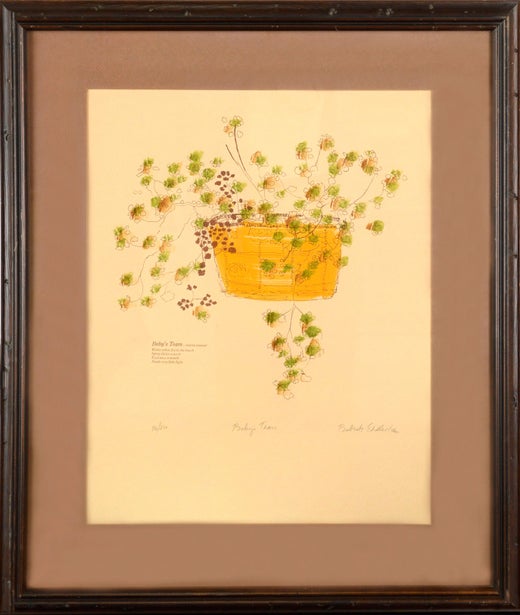Whimsical 1970's hand painted botanical silkscreen of baby's tears plant by Babette Joslyn Bauman Eddleston (American, 1922-1990). This limited edition screen print has splashes of color painted in by hand. The edition number 96/270 is written lower left. It is titled "Baby's Tears" and signed "Babette Eddleston" lower center and right.