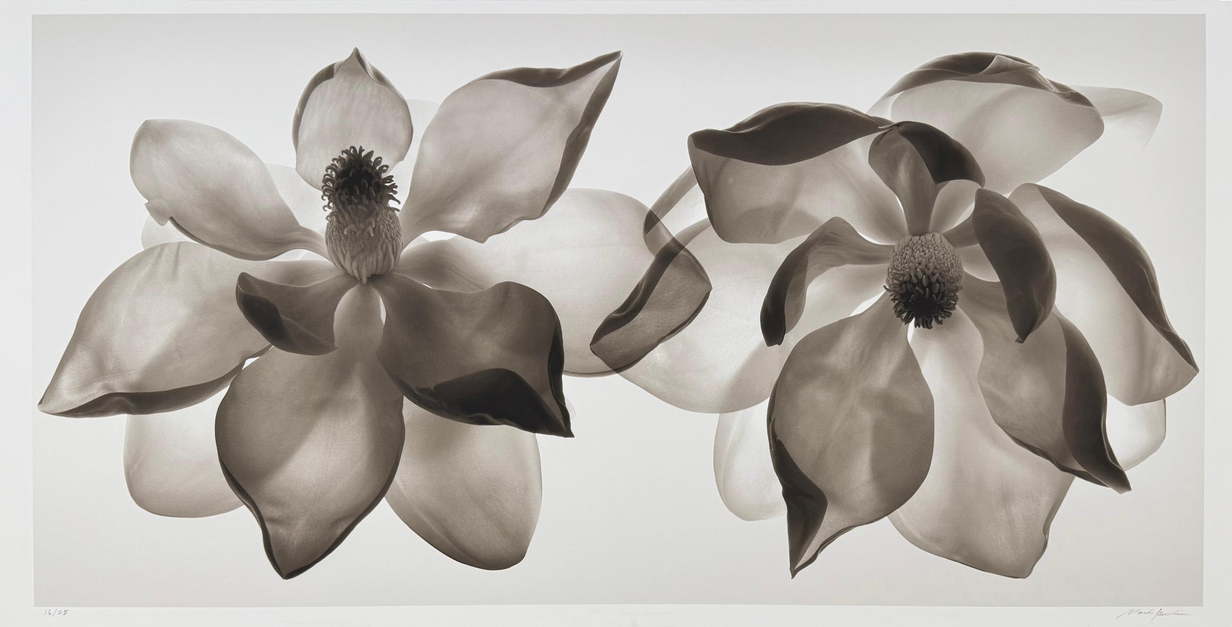 From an edition of 25. Photography and digital print of two backlit magnolia blossoms.