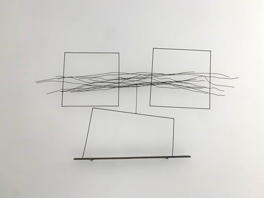 La escultura se compone de una base rectangular de madera, robusta y de acabado natural, sobre la que se erigen dos varillas metálicas verticales y delgadas. Una de las varillas sost...