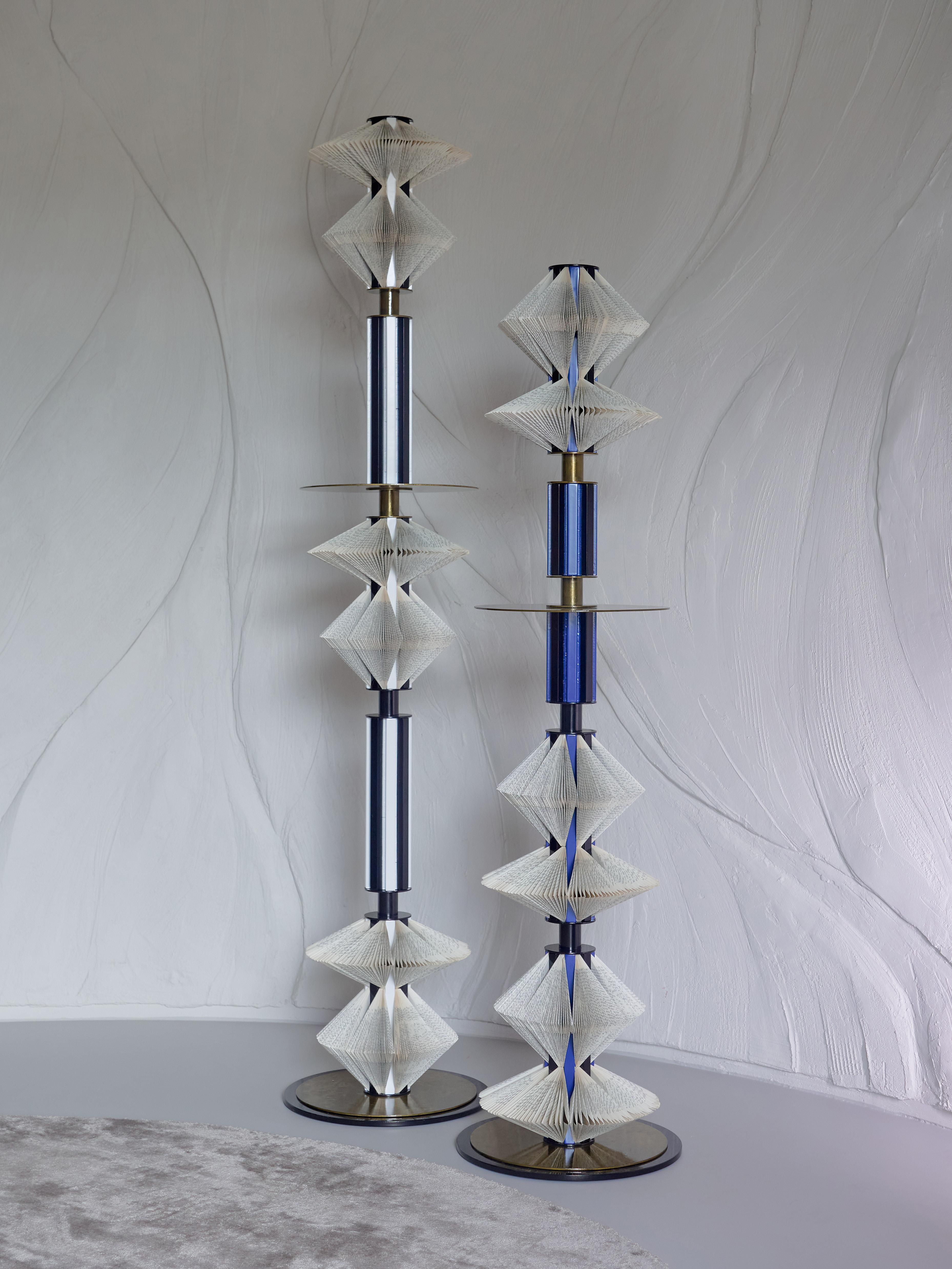 Book fragments, painted and lacquered steel, wood. H1-191 cm, H2-158 cm, Ø = 40 cm