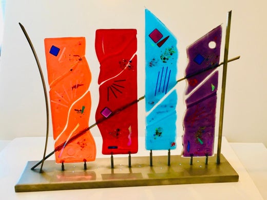 Impressions/ Expressions—The Art of Jill Casty Now working and presenting her art in California, Italy and Mexico, Jill Casty has focused in recent years on unique sculptures—ensembles of brilliant, colorful fused glass and various metals or works of glass solos. In the United States, an earlier stage of her career was devoted to the creation of large-scale works for public places—monumental sculptures, as high as 9.5 meters, and extensive series of “mobiles” and other forms of aerial art that provided identity and celebration for central locations in cities and in public and commercial buildings and centers. Her current work is more intimate in scale, personal in style, theme, and emotion. As befits these times that we live and work in, her art is innovative, “cutting edge”, even provocative in its own way. But unlike so much contemporary art, it is an art of flowing rhythms and form, bright, glowing color—an exuberant art, full of celebration and grace. In surprising, unique ways, in many works she combines the glass images created by fusion—dramatic, lyrical, elegant, with an evocative transparency—with the crisp, precise edges and surfaces—solid, self-contained—of varied patterns and types of metal, or even Carrara marble. These sculptures are created for hanging on walls or standing on floors or table tops. It is a “painterly” use of glass, the works like dramatic paintings in shapes and space. Color, as transformed in glass, is her guiding force and passion, Henri Matisse her guiding spirit. Inspired by his quest to see “…how to make my colors sing.” For everyone knows, he wrote, that “Good color sings. It is melodious, aroma-like, never over-baked…, can inspire ideas of joy, of riches, of glory and love.” Her colors, layered and textured, full of light and energy, capture this spirit. They are rich, serene or bold, vivacious. She capitalizes on the unique open-ness of fusions and re-fusions of clear and colored glass—as colors shift and change their tones, impressions, subtleties as they interact with the play of changing light. Reflecting light, changing light on its passage through the glass. There is an inner spirit, an interior narrative within the formal structures and abstractions of her work. In each, and in varying ways, she seeks to capture the continuing drama of spirit—beauty, hope, connection, compassion, love—within material form, the material world. That drama, that narrative, reflects her sense of possibility. She sees a kind of re-opening, an affirming light in the innate presence of the glass. She enthusiastically follows the banner of the artistic credo of Pierre August Renoir about the place of, indeed the need for beauty in the world: “To my mind, a picture should be something pleasant, cheerful, and pretty, yes pretty! There are many unpleasant things in life as it is without creating still more of them.”