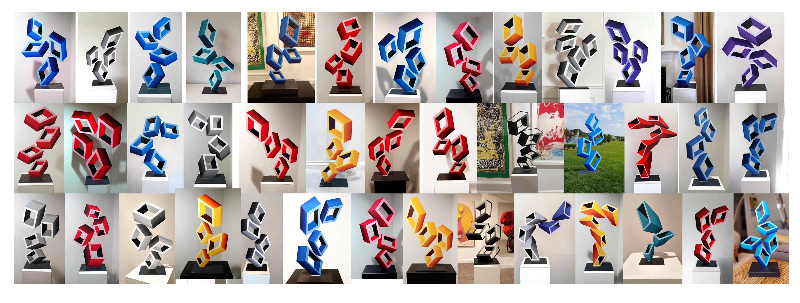 He first designs how the formation of "Boxes" will layout and then hand cuts the shape he has just designed. He then welds the flat sculpture he has created to the metal base and then paints his sculpture with a trompe l'oeil or Fool the Eye effect so that the flat sculpture has volume and depth. He then paints the reverse side in the same manner so that the sculpture can be displayed facing either direction or in front of a mirror. This Sculpture measures 28" H x 24" W and is incredibly only 1/16 thick. The base measures 8" x 10". It is signed on the base and numbered 1 of only 4. It is a unique one of a kind sculpture, It is numbered 1 of 4 because there were only 4 sculptures with this box configuration at this size, but they are all unique because Sanseviero paints each sculpture to create the illusion effect. I have also included images of the sculpture in different room settings so you can see that the sculpture works well in both traditional and contemporary surroundings.