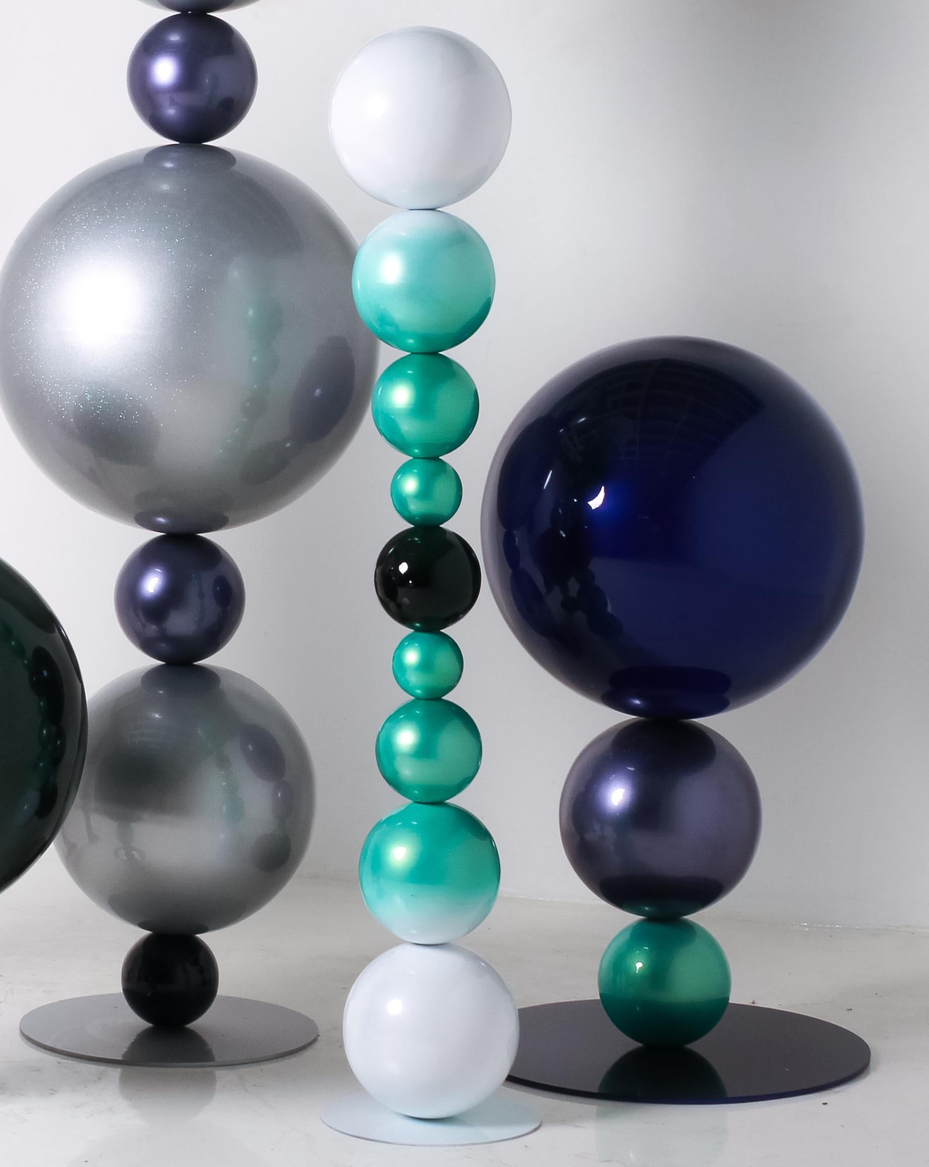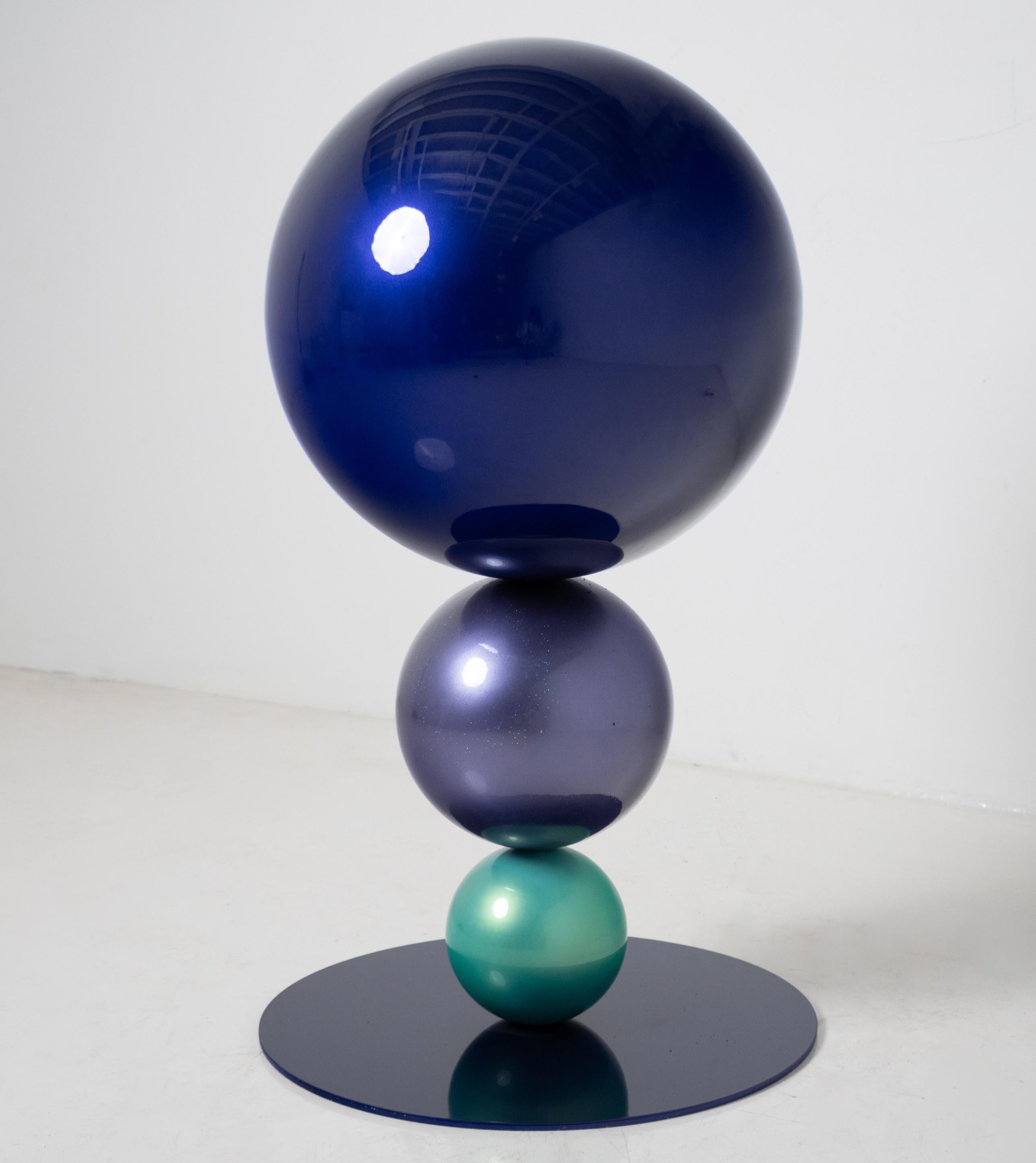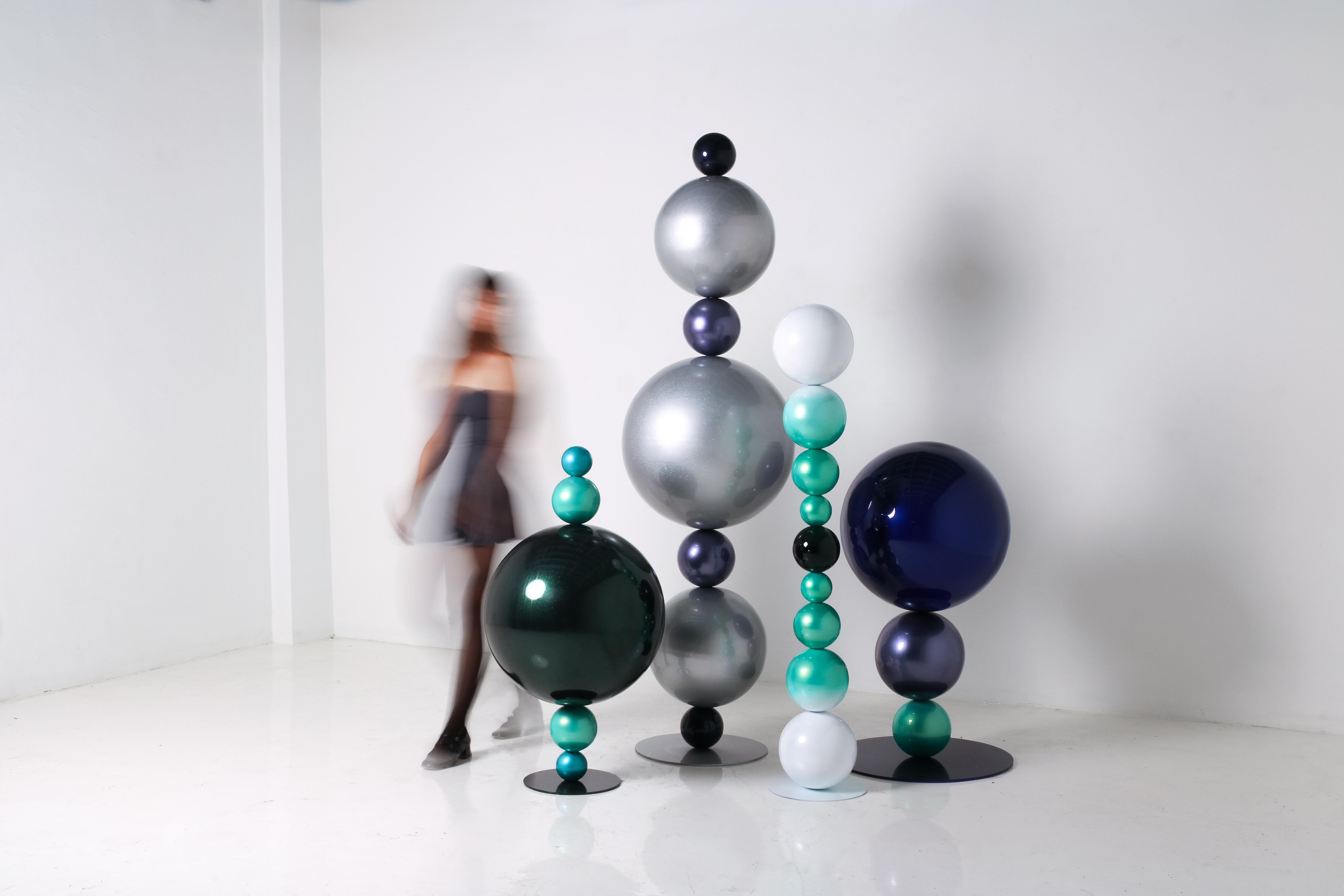 His signature, playful works made of reflective steel spheres capture the symmetry, volume and balance present in both nature and design. These spheres are placed together to create new forms that reflect the vibrant and dynamic nature of the world around us, and the impact of our ever-changing perspective. Kolodny’s site-specific and shapeshifting installations construct a kinetic and immersive environment for viewers, creating space for moments of mindfulness and self-reflection within their experience. Transcending the traditional boundaries of art, the artist creates new worlds with each installation, that are at once both fantastical and organic. His practice seeks to encourage viewers to engage with the world around them in new, more meaningful and imaginative ways, inspiring a childlike wonder.