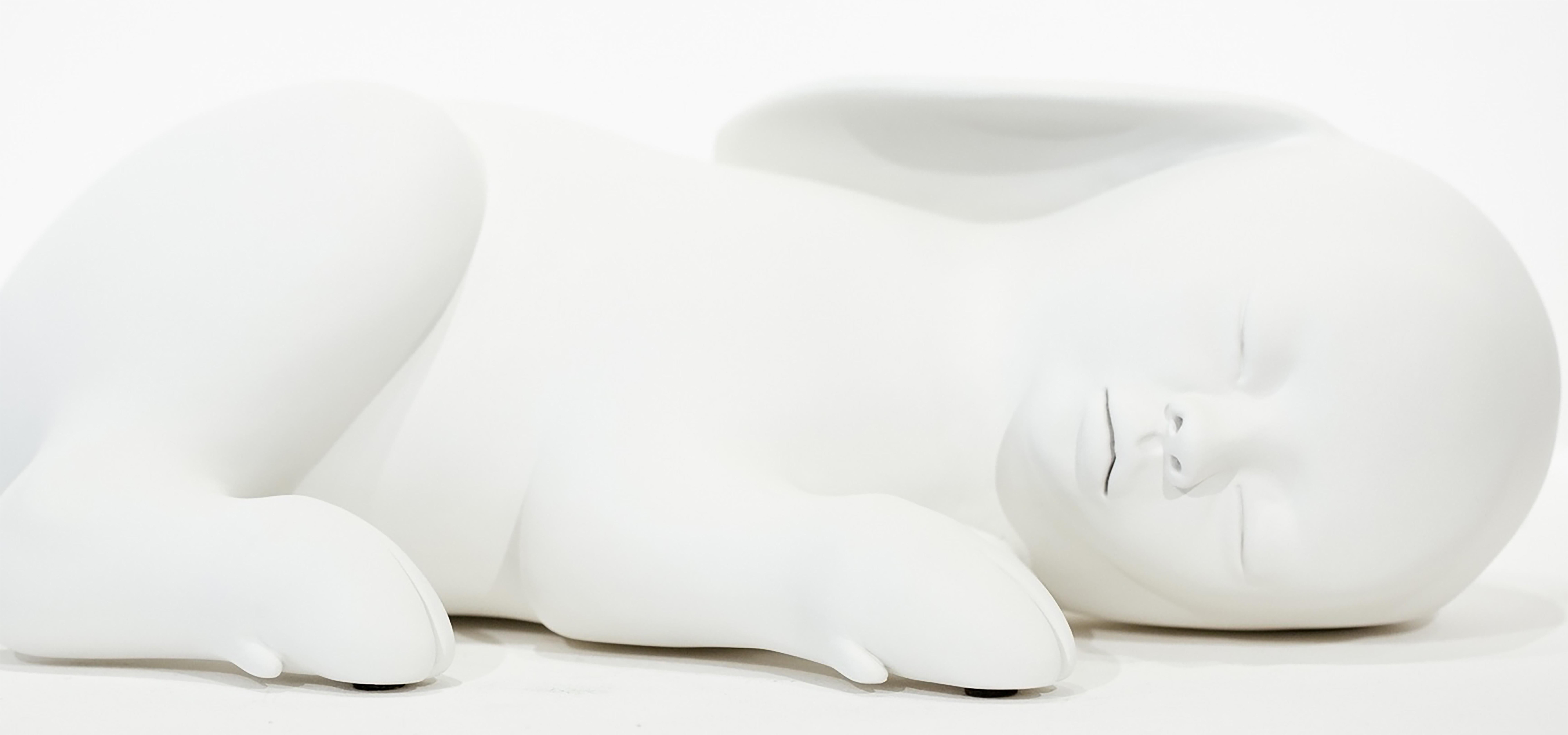 This white figurative sculpture titled "Nebrida" is an original artwork by Clémentine Bal made of polystyrene, resin, mastic, marble powder, and paint. This piece measures approximately 21”h x 9”w x 6”d.