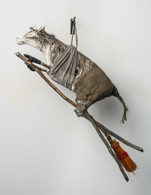 Elizabeth JordanSculpture of hare on wood base with mask on: 'Children 11'2020
