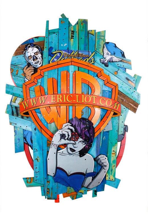 He has this particular technique of mechanic silversmith who makes him turn old boards into precious totems. It elegantly mixes images and references to recreate modern icons.