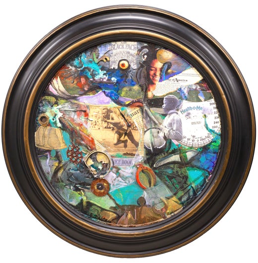 "QUEEN VICTORIA" is created and from acrylic and found objects on round MDF panel by renowned Black African American artist Richard J. Watson. It includes a photograph of a figure, p...