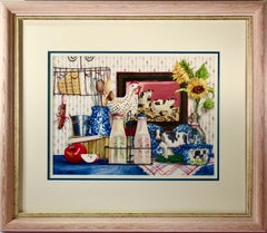 A realistic painting of an assortment of glassware set atop a wooden desk by artist Christopher Garvey. A fitting muted back...