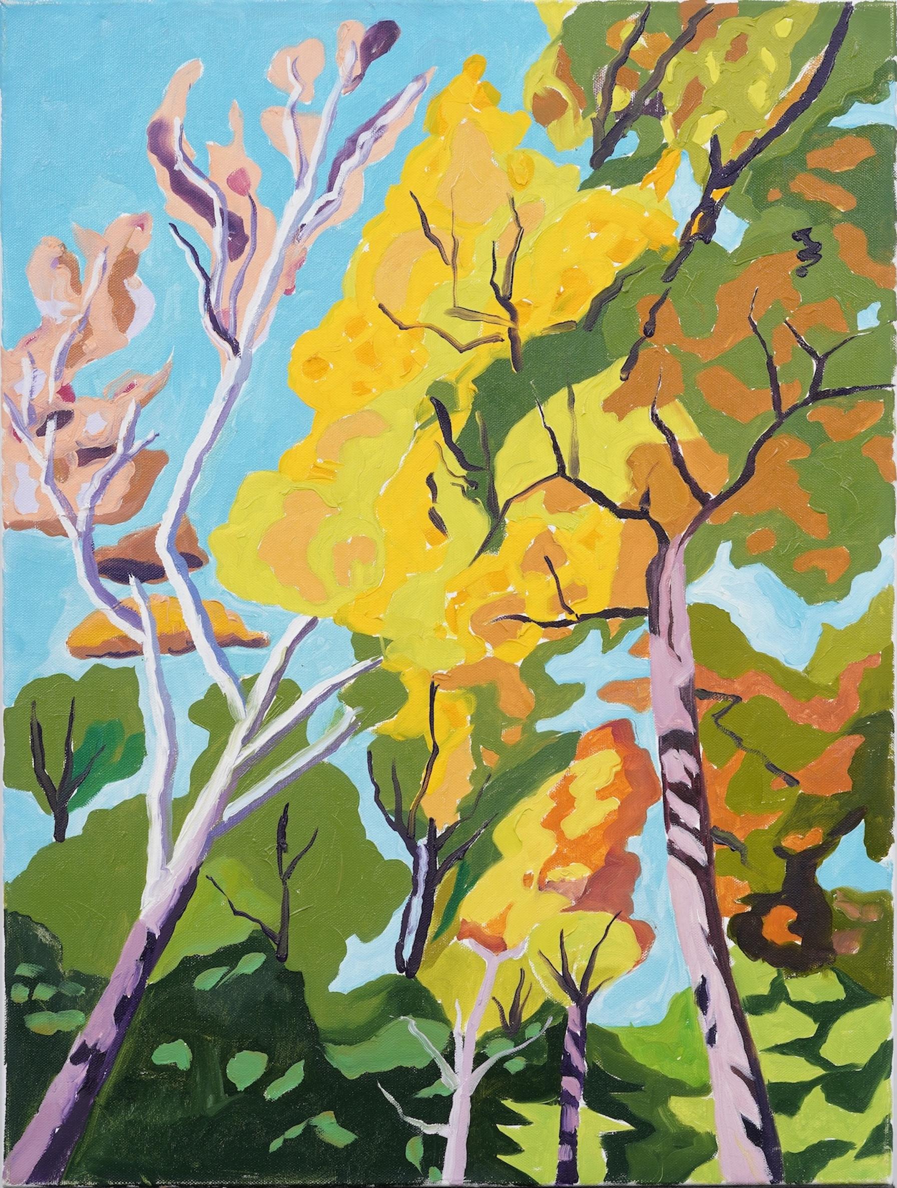 Vivid abstracted landscape in vibrant fauvist hues of birch trees in green field by Libby Beth Seligman (American, b. 1958), 1977. Signed and dated lower right corner. Presented in r...