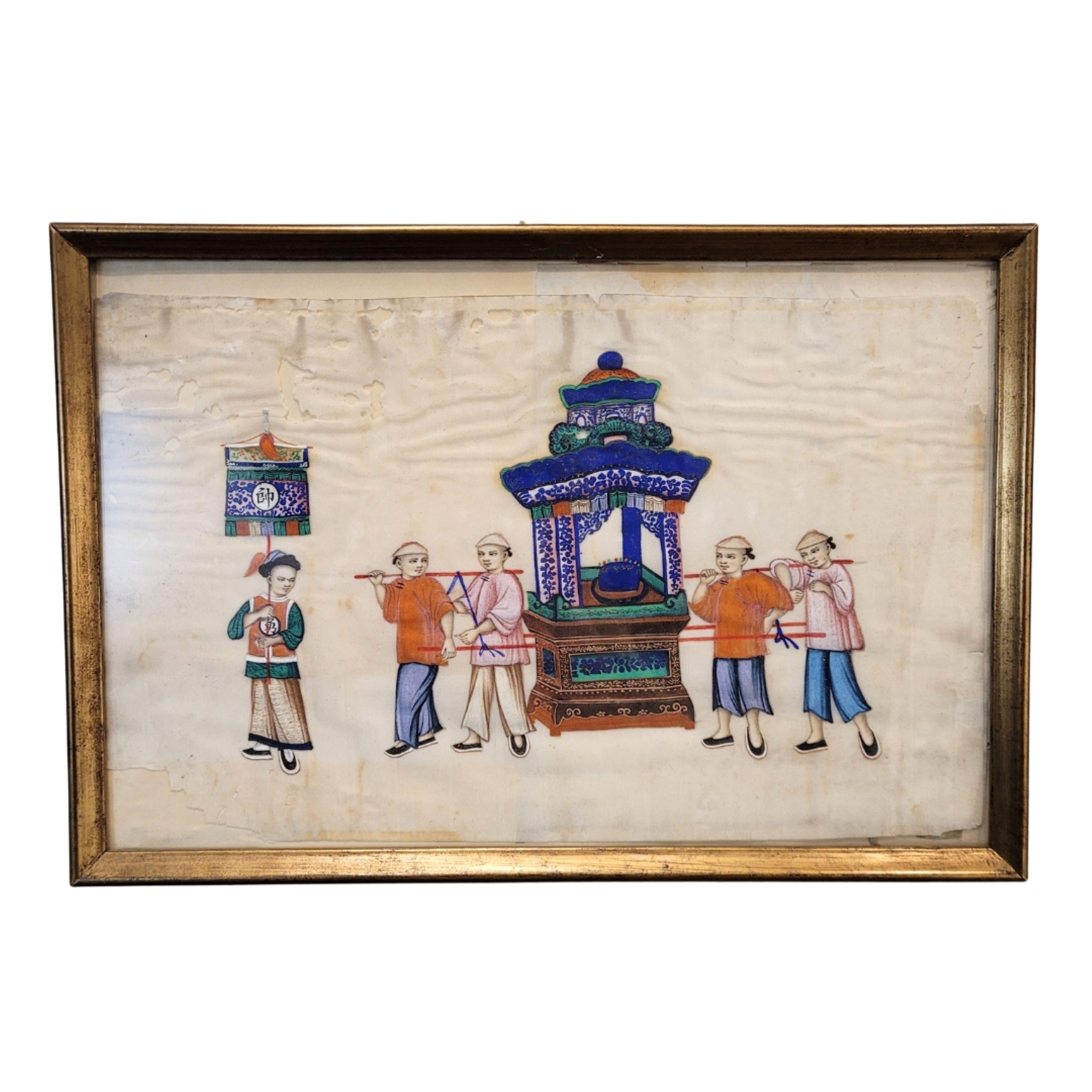 This pair of ancestor portraits was hand-painted in the 19th century and beautifully depicts a Qing-dynasty couple. While some ancestral portraits offer a more stylized representation of one's ancestors, this particular pair is painted with incredible realism and life-like expressions. Rather than depict the pair in a regal hall wearing elaborate finery, the couple is shown in a quiet home environment, seated at either end of a square tea table. Their surroundings are minimal, practically undecorated, and they wear simple, matching blue silk robes...