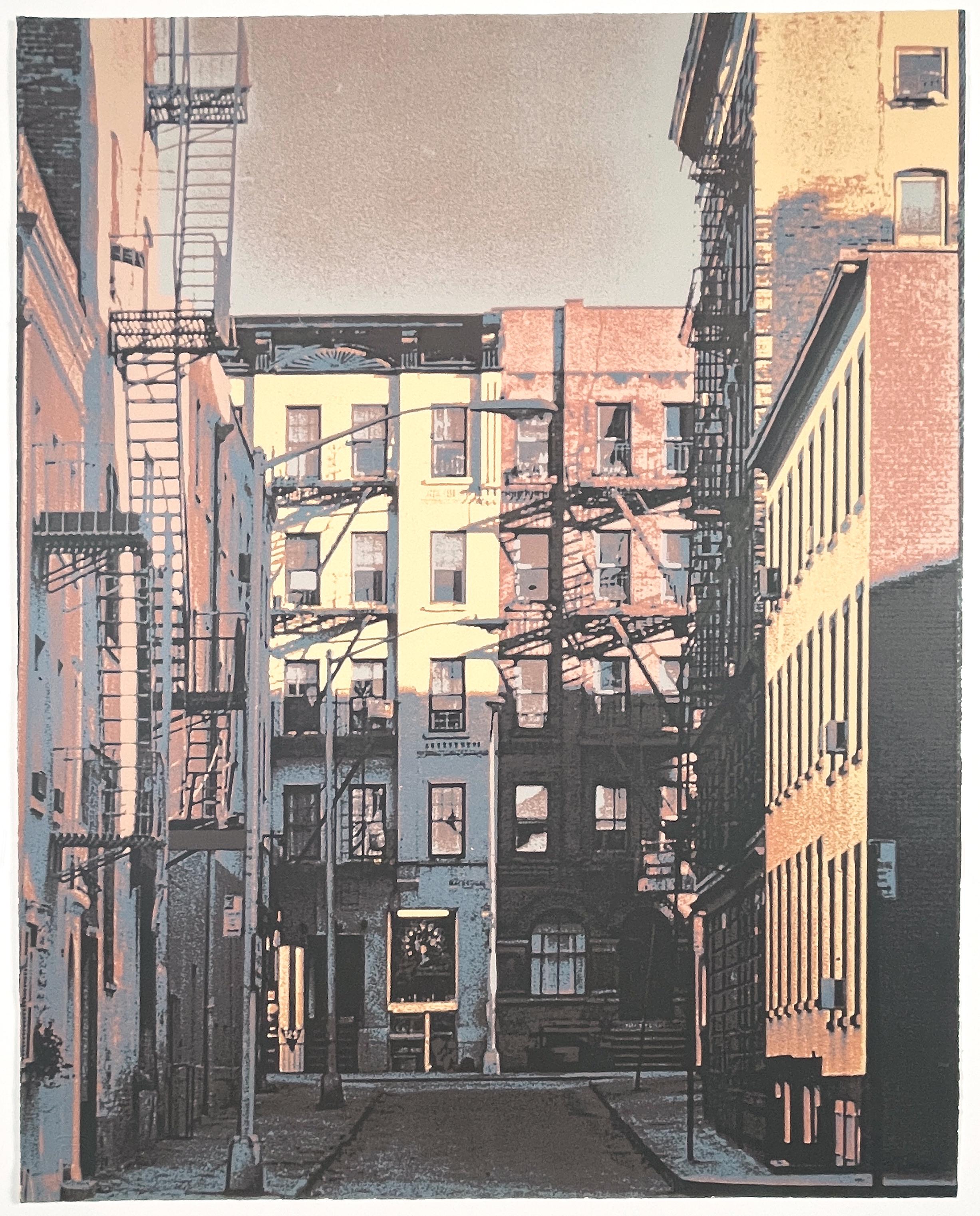 Artist Onelio Marrero depicts the bustling energy of Midtown Manhattan traffic, looking south on a rainy afternoon. Dashing yet precise brushstrokes convey move...