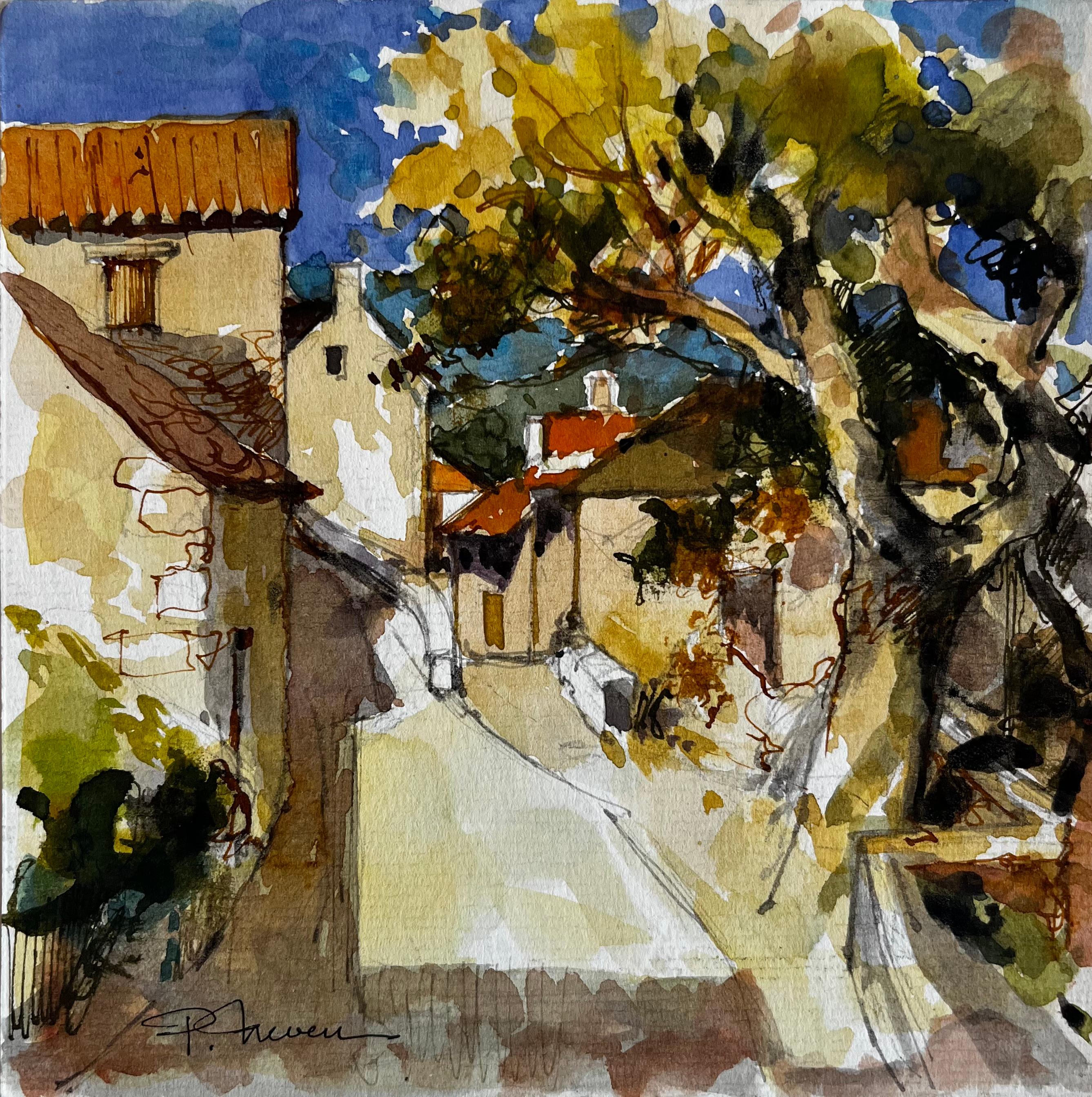 Menton Sunlit Street with Trees and Distant Hills Watercolor