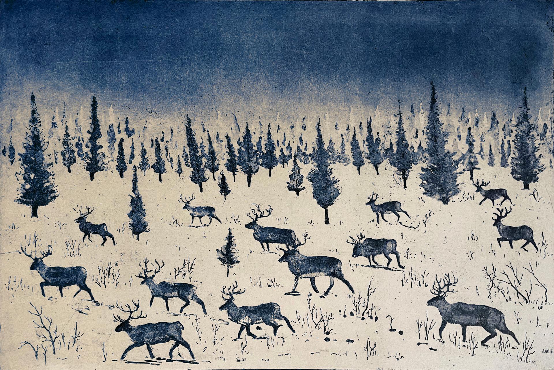 This artwork titled "Intrepid Caribou" 2002 is an original color stone cut on Japan paper by noted Canadian/Inuit artist Kananginak Pootoogook, 1935-2010. It is hand signed, dated, titled, located, described and numbered 22/50 in pencil by the artist. The image size is 18.5 x 12.5 inches, sheet size is 23 x 16 inches, framed size is 24.85 x 29.65 inches. Custom framed in a black metal frame, with black matting. It is in excellent condition.
