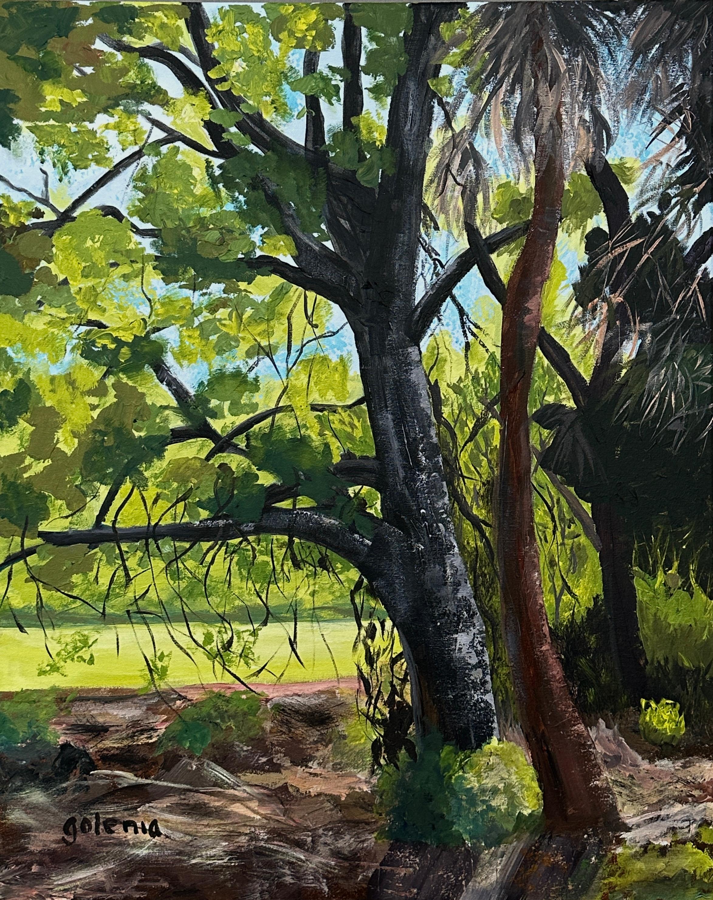 Gerald Berghammer - Color minimalist landscape photography. Lush tropical greenery with palm trees and a narrow waterway in the center. Archival pigment ink print as part of a limit...