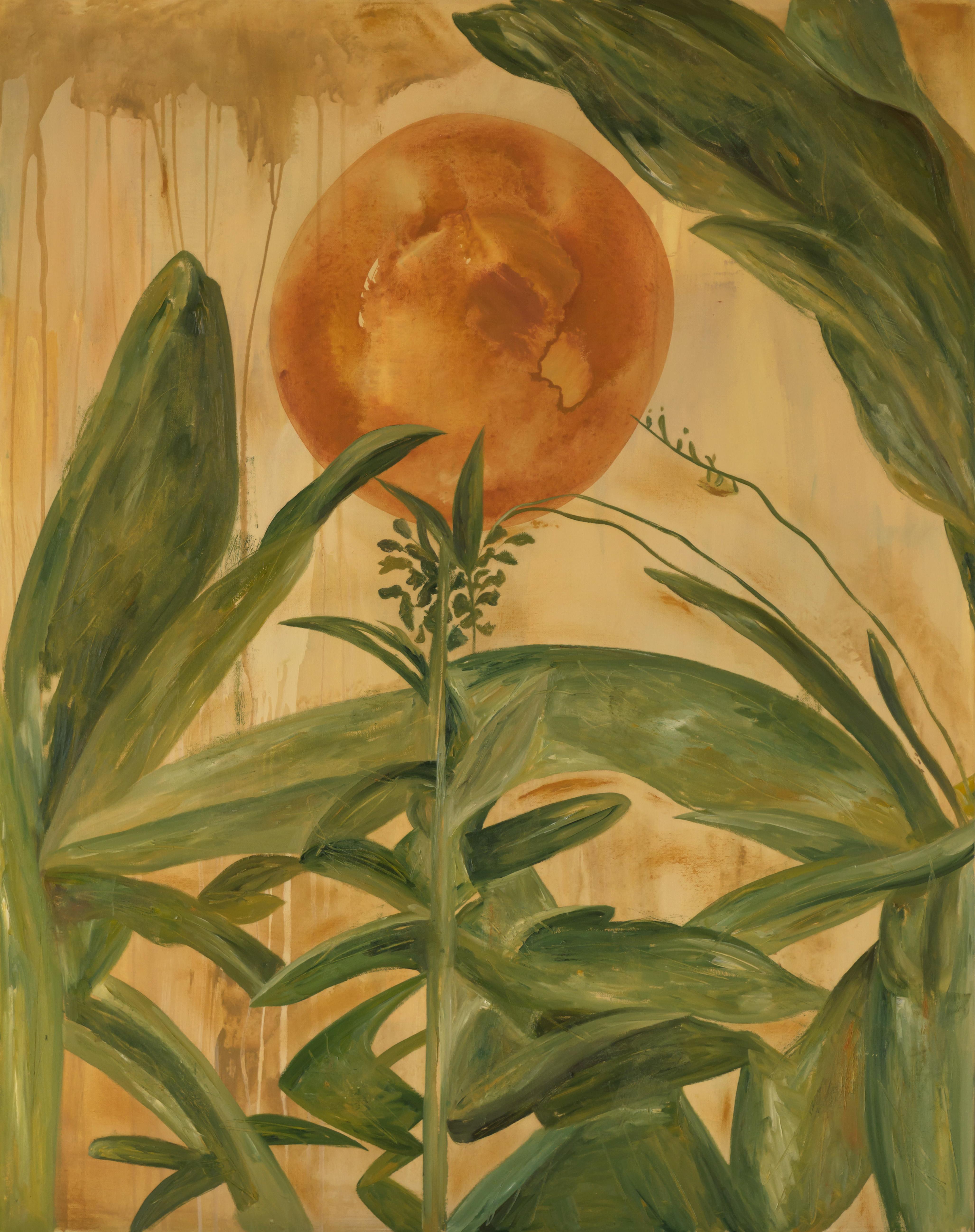 Artist Guigen Zha presents a stylized portrait of a woman’s head, adorned with floral and tree-like elements against a backdrop of blue sky, moon, and seascap...