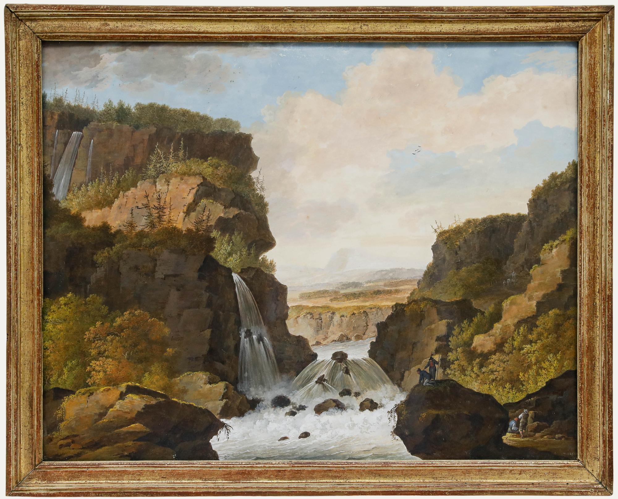 Dimensions with frame: 40 x 46 x 6 cm Signed "Bisi" in the lower left corner. This exceptional 19th century European landscape painting depicts a dramatic mountainous panorama animated by an elegant traveling party resting along a wooded riverbank. Executed in the Romantic tradition, the composition masterfully balances sweeping alpine peaks, atmospheric sky, and finely detailed foreground figures. In the distance, rugged mountains rise beneath a luminous sky filled with soft clouds, while warm autumnal tones enrich the rolling hills. The foreground reveals a noble entourage—figures on horseback, attendants, and travelers—gathered along a tranquil river. Their period attire and banners suggest a historical or courtly narrative, adding refinement and storytelling to the natural grandeur of the setting. The artist demonstrates remarkable skill in perspective and light, creating depth through layered mountains and delicate atmospheric effects. The foliage is rendered with meticulous detail, and the interplay of shadow and sunlight enhances the romantic mood of the scene. Likely Continental European, this work embodies the ideals of 19th century Romantic landscape painting, where nature’s sublimity meets human presence. The piece would make a distinguished addition to a traditional, classical, or Grand Tour–inspired interior. A refined and decorative work of strong visual impact, combining historical charm, painterly finesse, and timeless appeal. 19th century landscape painting, antique European landscape, Romantic mountain painting, alpine landscape art, Grand Tour painting, historical scene painting, equestrian figures painting, classical European art, antique oil painting, 1800s landscape artwork, Continental school painting...