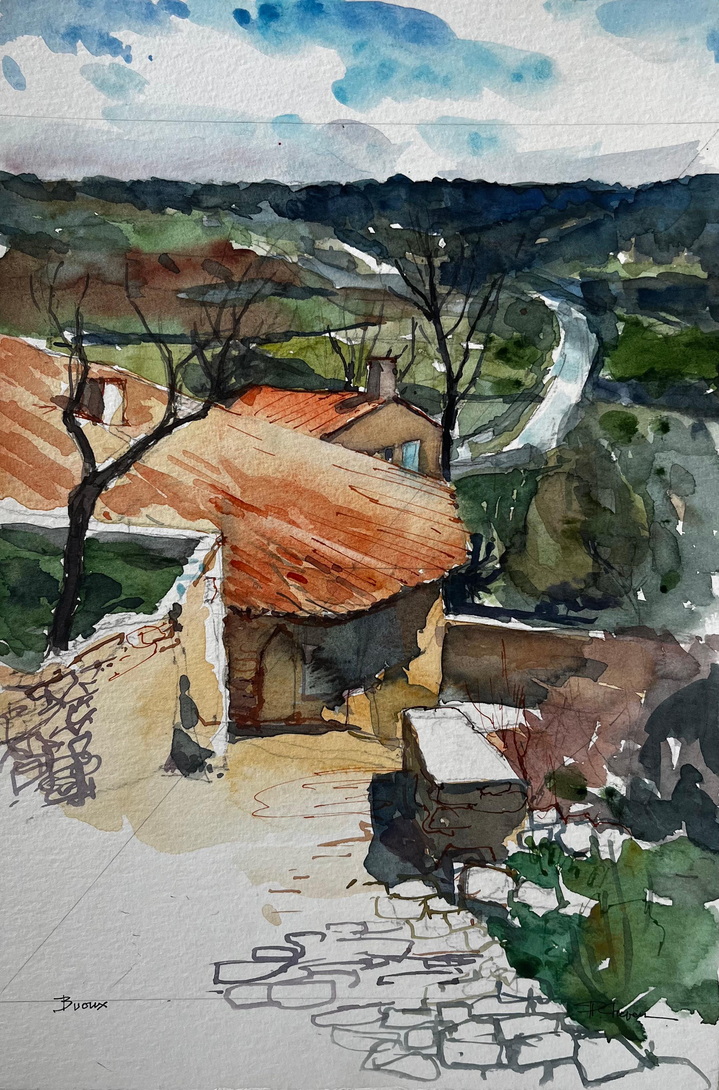 Title: French Hilltop Village Fields Distant Landscape and Clouds Watercolor