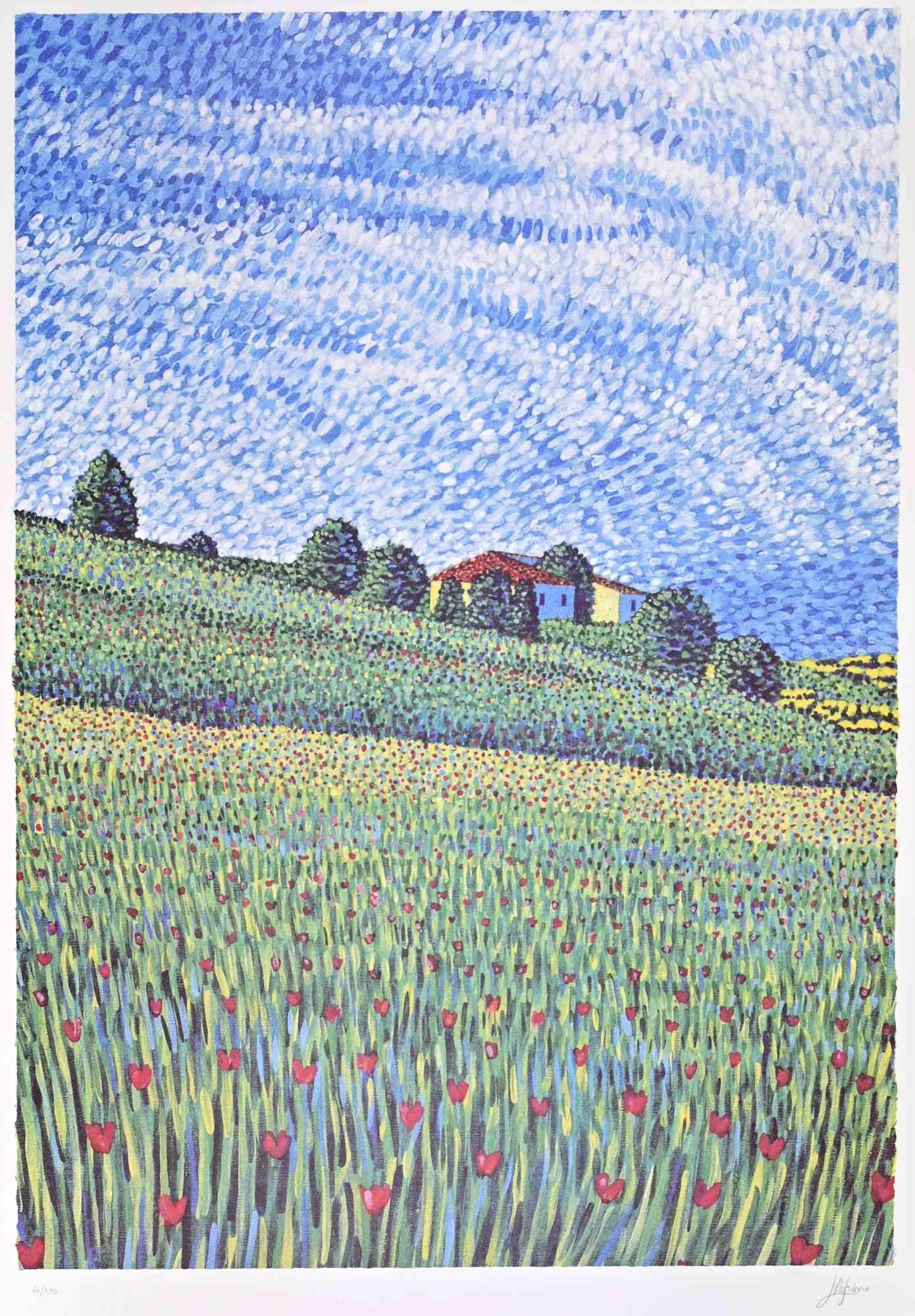 Gerald Berghammer - Color Tuscany landscape photography. Landscape with rolling hills, a single tree, a huge cloud, and a field of dry grass. Archival pigment ink print as part of a...