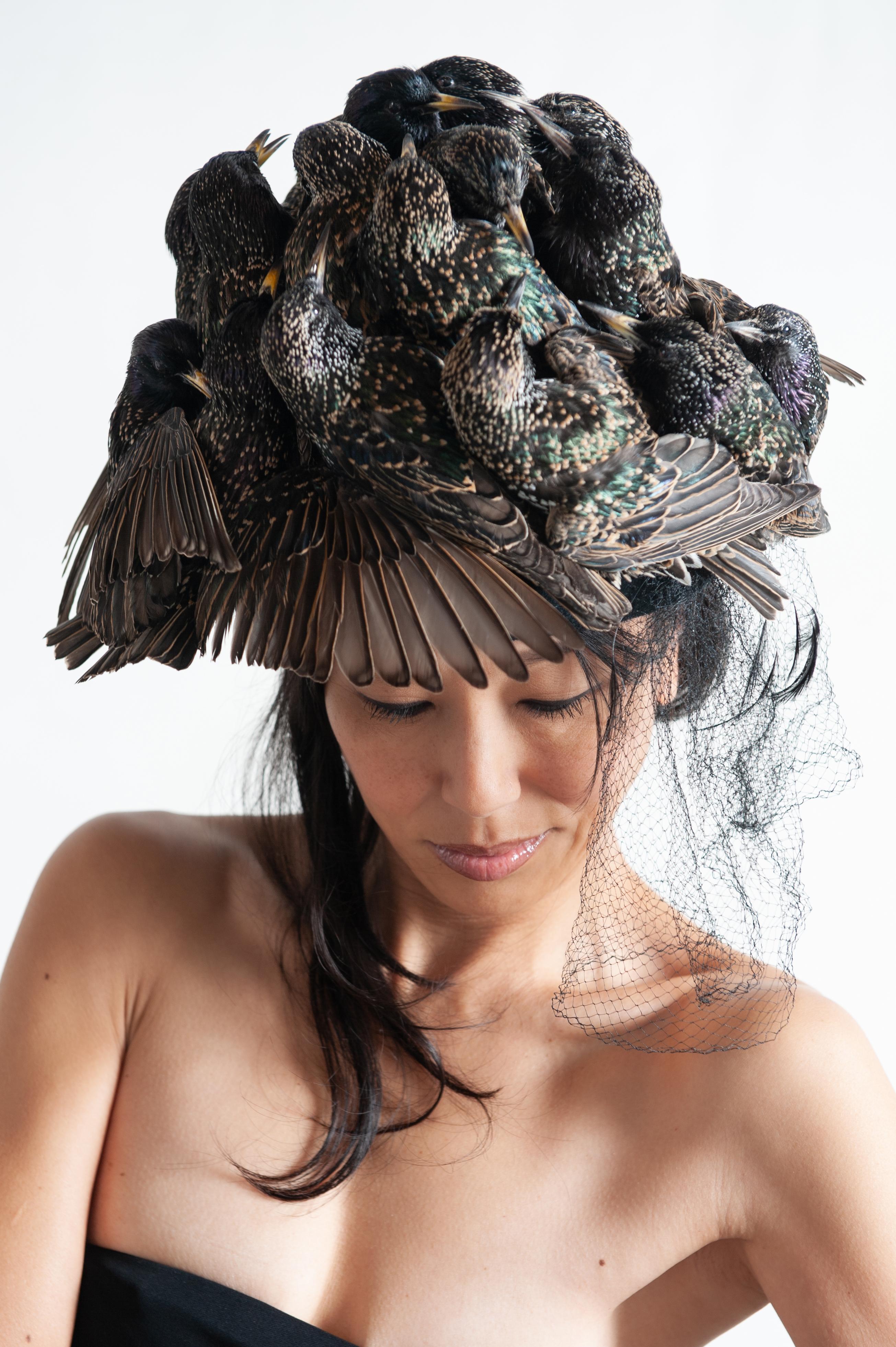 Artist Guigen Zha presents a stylized portrait of a woman’s head, adorned with floral and tree-like elements against a backdrop of blue sky, moon, and seascap...
