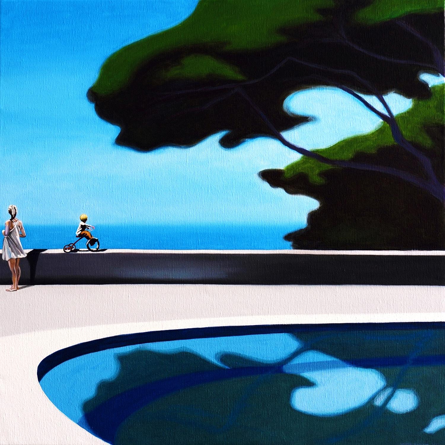 The artist skillfully balances narrative detail with atmospheric landscape painting. Warm sunlight illuminates the architecture and shoreline, while soft clouds diffuse the sky, enhancing the depth and tranquility of the scene.