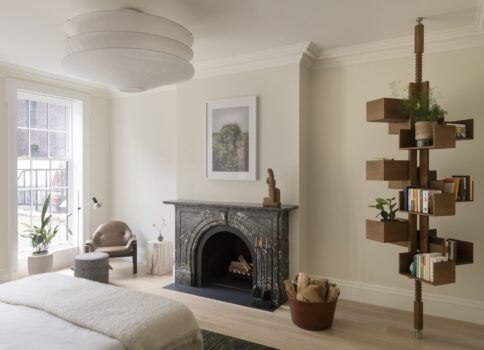 “Furniture is a key component that shapes an interior space and adds life, comfort, functionality and style,” Gatserelia says. The bedside lamps are by Karen Chekerdjian and the mirror is by Antoni Gaudí. The room also includes a Banquette bench by Marc Bankowsky and an Aster X chair by Jean-Marie Massaud.