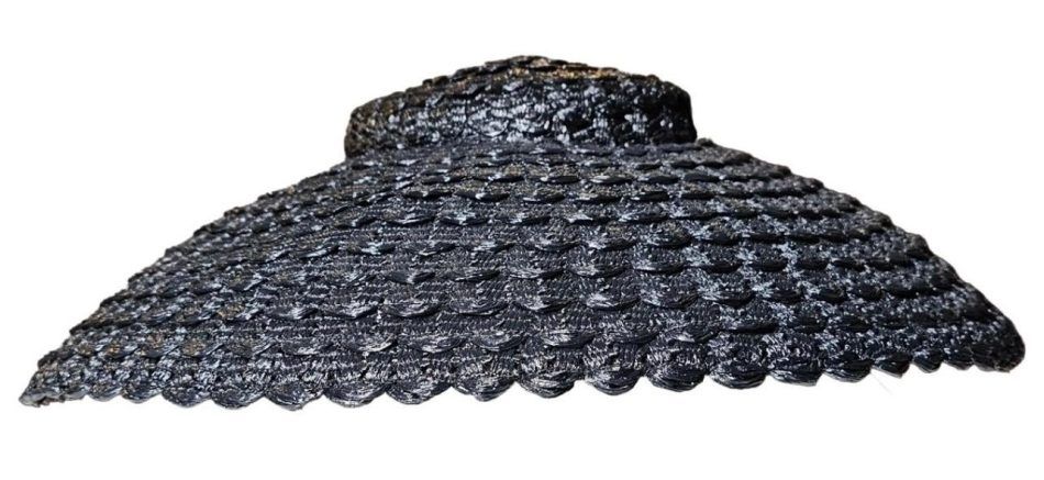 Meticulously woven from jet-black wicker by the house’s haute couture atelier, the sloped saucer has a dramatic wide brim and a shallow crown, and is lined with a simple band of grosgrain ribbon.