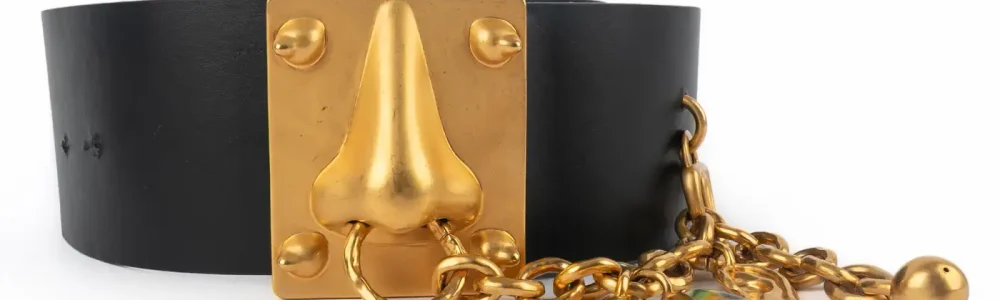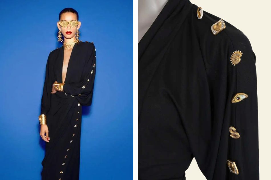 Among the many celebrated signatures of the revived Schiaparelli, Roseberry’s figurative brass accents are a standout. “The bijoux buttons punctuate the black surface of this dress like miniature works of art,” says Mario Margelist, of LUX, who is offering the dress on 1stDibs.