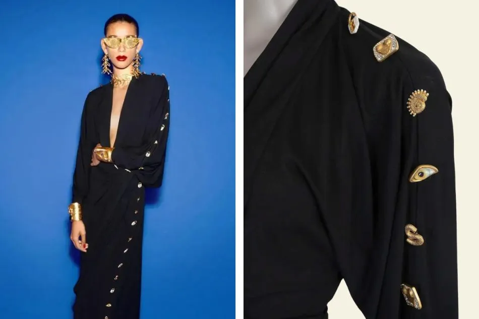 With a plunging V neckline, blouson sleeves and wrap-style skirt, the garment has an archetypal silhouette. But the bijoux buttons elegantly distort its classic form with icons embedded in Schiaparelli’s DNA. A padlock, a heart, a nautilus seashell, a human eye, the letter S and a female torso adorn the sleeves and sides of the dress with a captivating shine. “They transform a simple wrap silhouette into a piece of sculpture,” says Margelist.
