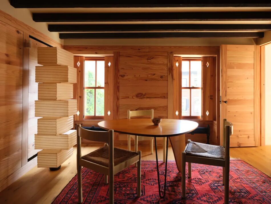 While the rest of the home masterfully mingles edgy art, bold colors, sumptuous furnishings and historic architectural elements, the top floor, with its blond-wood cladding and cutout shutters, looks more like a Swiss chalet.