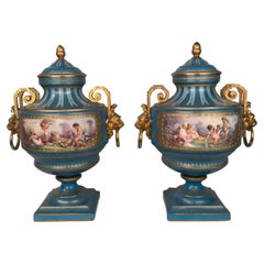 Antique Pair French Bleu Celeste Sevres Urns 19th C