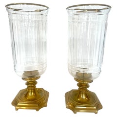 Pair of brass and hurricane glass lamps
