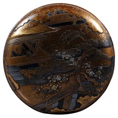 This antique kashiki candy dish features a refined design of paulownia and bamboo executed in fine gold maki-e over a deep black lacquer ground. The paulownia is associated with puri...