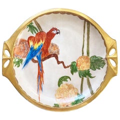 A vintage Art Deco or Art Nouveau porcelain serving dish with a parrot motif. This ceramic serving