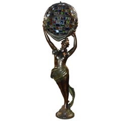 Art Nouveau lady figurines cast in white metal with dark patina finish. Holding spheres that must have had ribbons attached. Left and right sides. At 48" in height and 12" wide. The ...