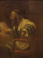 In this intimate oil painting the artist renders the picture of a Rabbinic scholar at prayer in a very intimate scale.