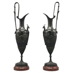 Pair 19th Century Greco-Roman Neoclassical Bronze and Rouge Marble Ewers