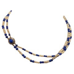Lapis Lazuli beads are paired with baroque pearls in this classic and versatile necklace. The 10 mm lapis beads are bright blue, well shaped and polished. The white pearls are rand...