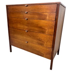 Walnut dresser with 8 drawers designed by Jens Risom. Four narrow drawers on left, flanked by wider drawers on right. Top drawer includes brass push button latch and hinges, allows...