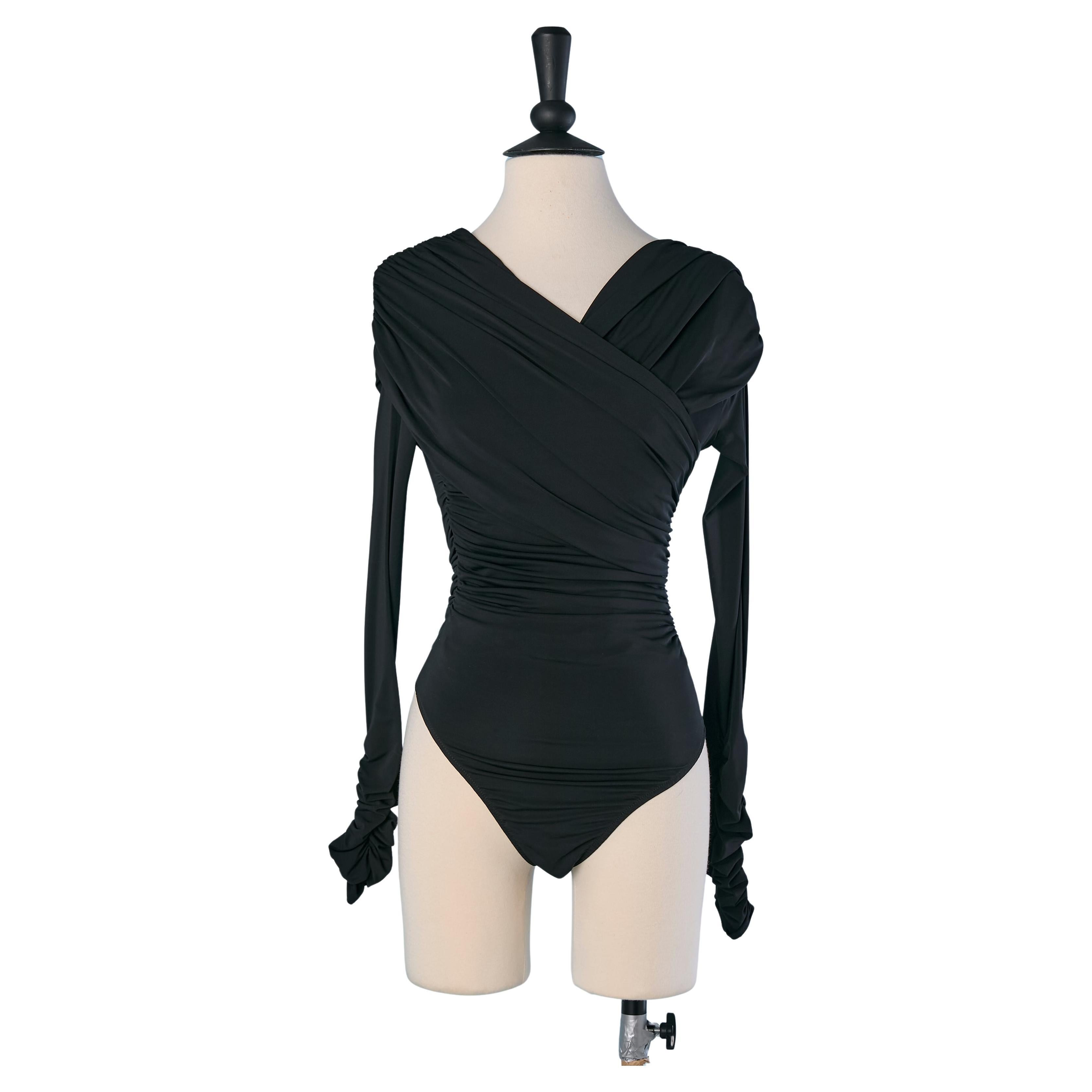 Black jersey draped wrapped cocktail dress. Same jersey as lining. Invisible zip closure on the middle back. Shoulder pad. Gather above and under the waist. SAMPLE
