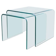Minimalist pair of Italia nesting or drinks tables designed by Angelo Cortesi for Fiam Italia. Each has a modern waterfall design made of bent crystal glass and each is signed on the...