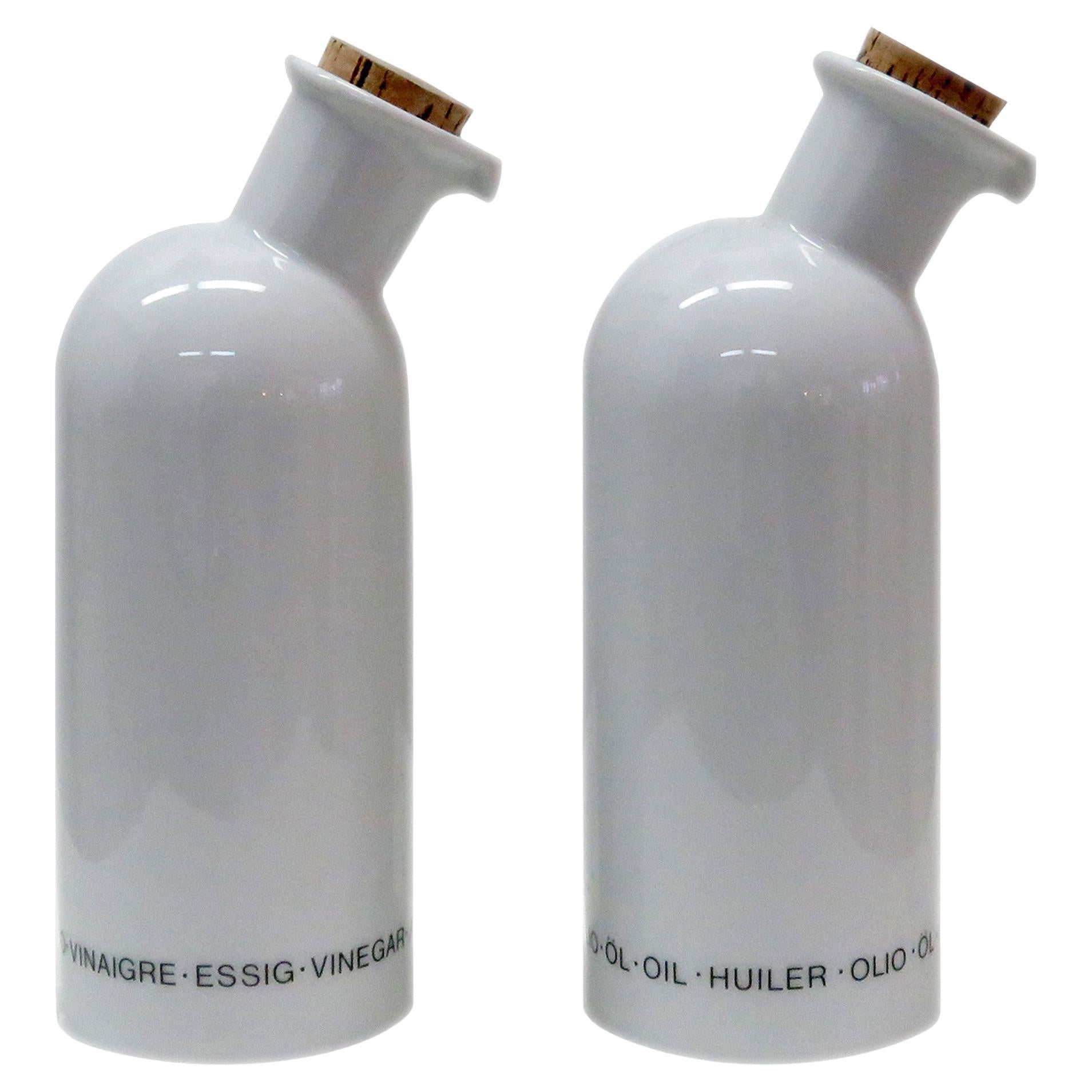 Wonderful white porcelain oil and vinegar serving bottles by Arzberg, Germany, with cork caps, multilingual signage, marked.