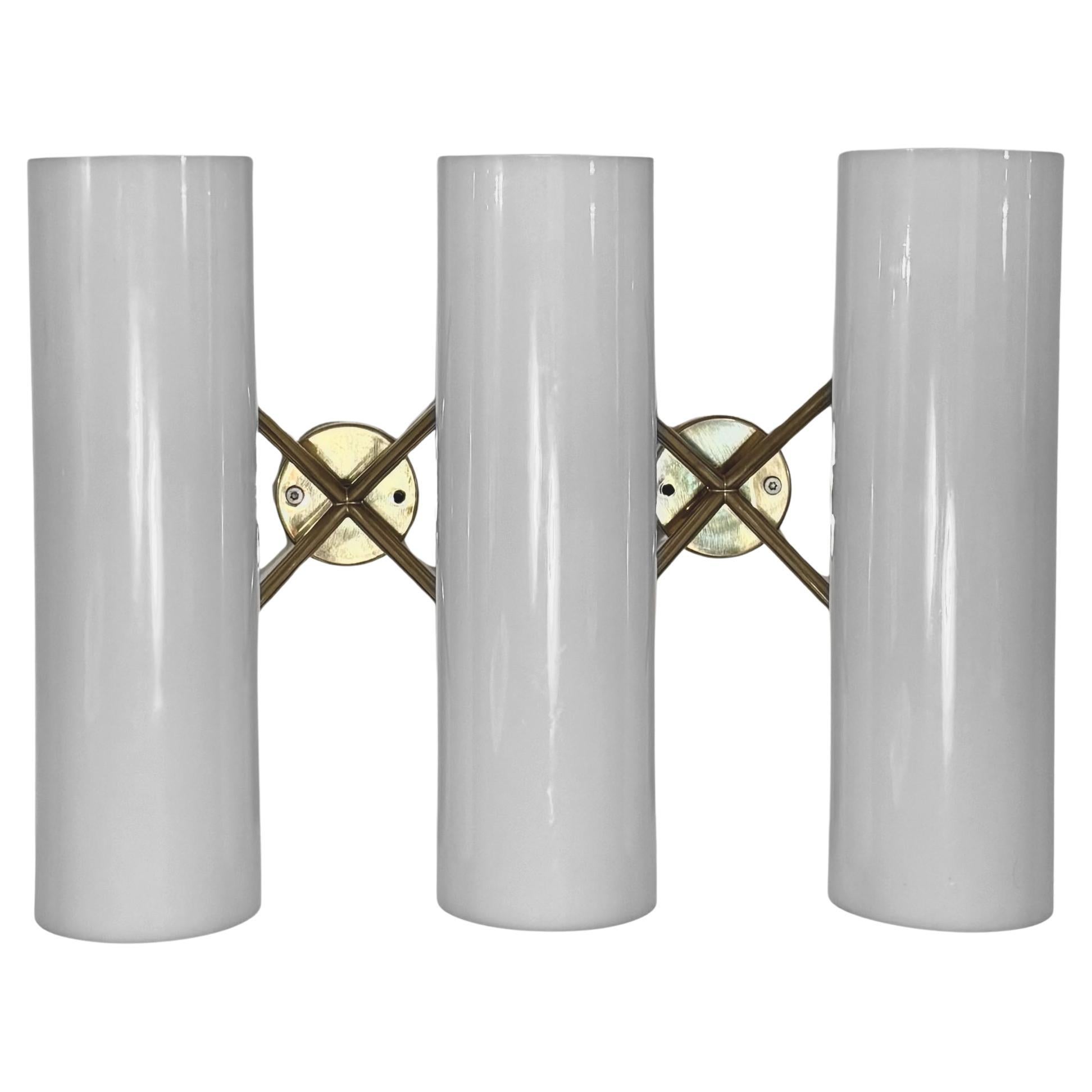 They are made of a brass foot supporting a large white plexi chandelier with the characteristic diffuser unde...