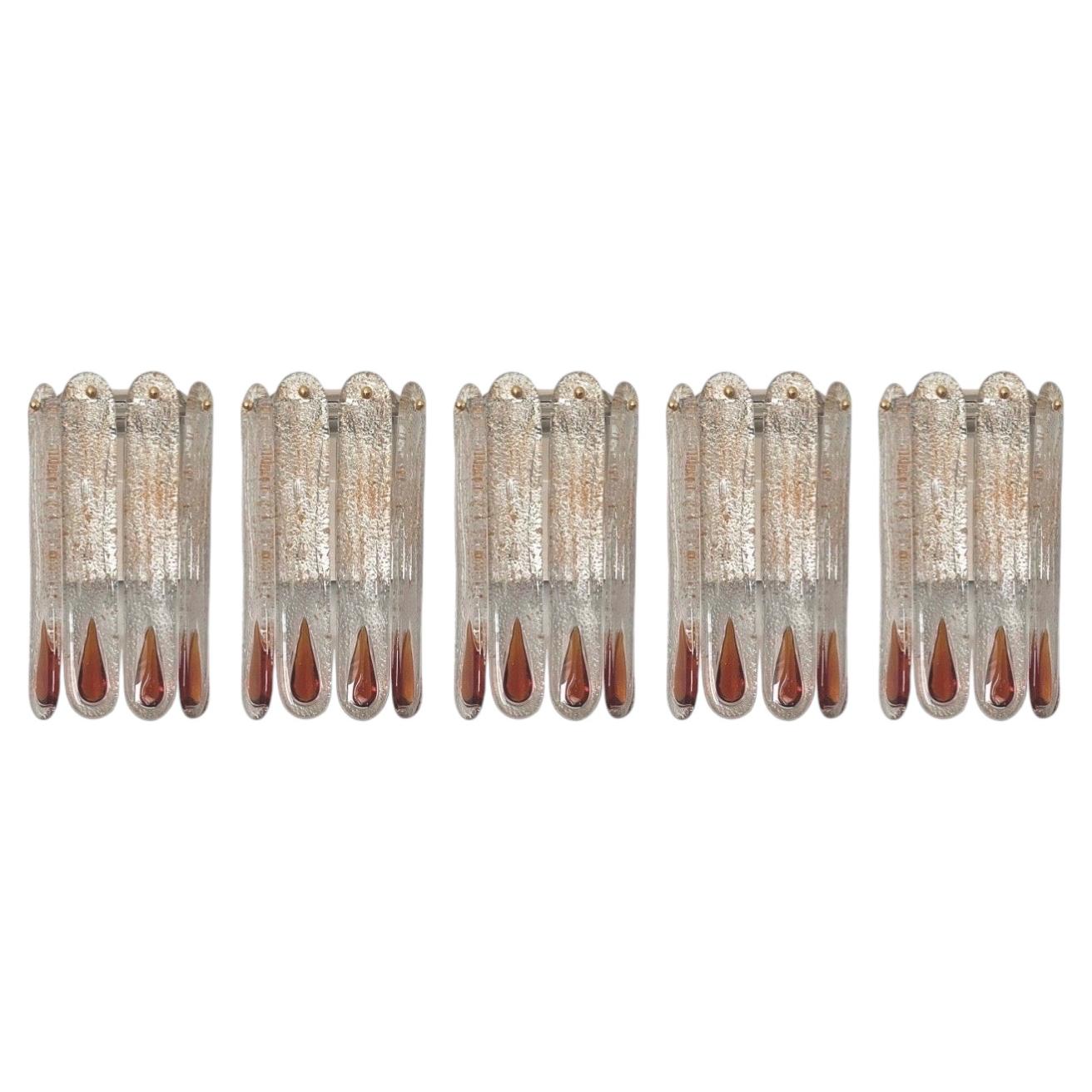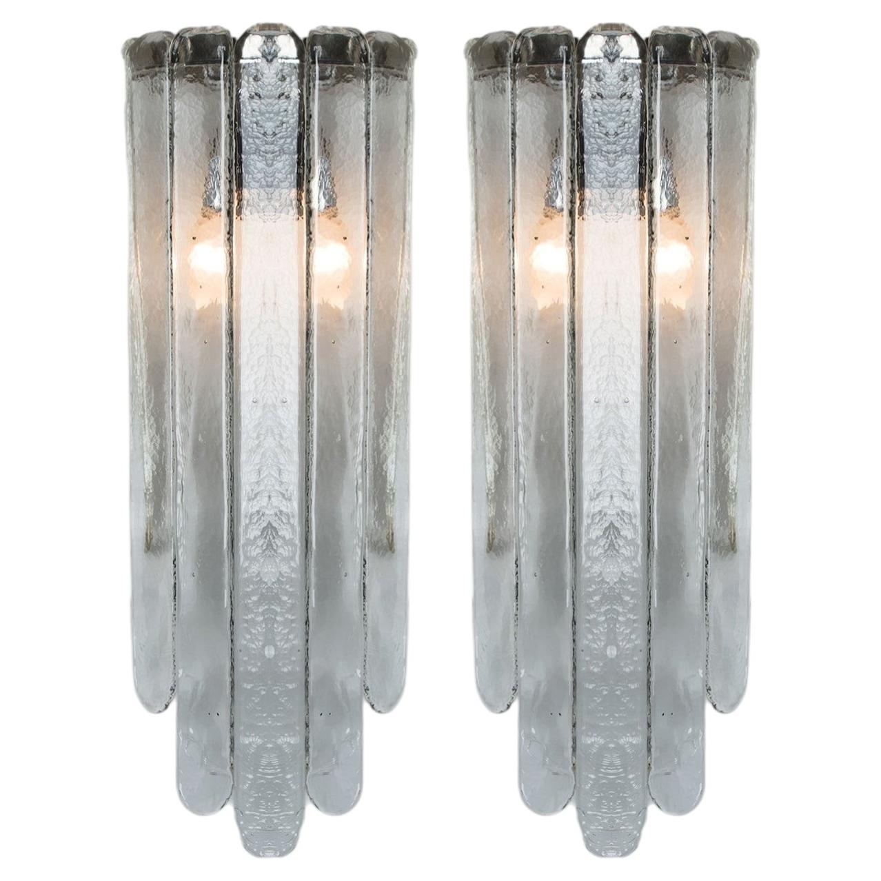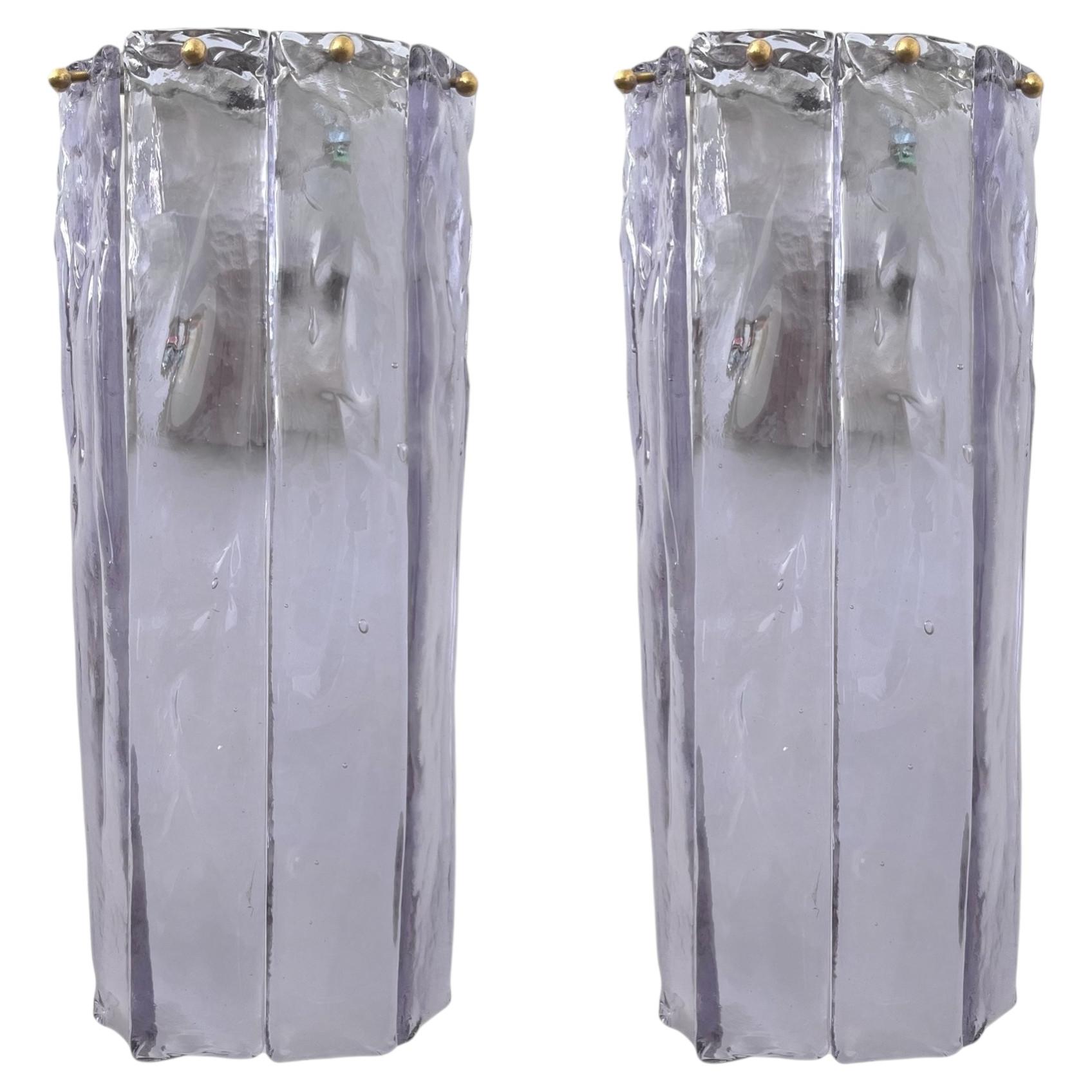 A colorful, vintage Mid-Century modern pair of Italian wall sconces, appliques made of hand blown smoked Murano glass produced by Mazzega, in good condition. Each wall light, lamp is composed with five yellow and white twisted glass pieces which are hanging on short slanted arms, supported by a rectangular polished brass frame. The detailed lighting features a two light socket. The wires have been renewed. Wear consistent with age and use. Circa 1960 - 1970, Murano, Italy.
