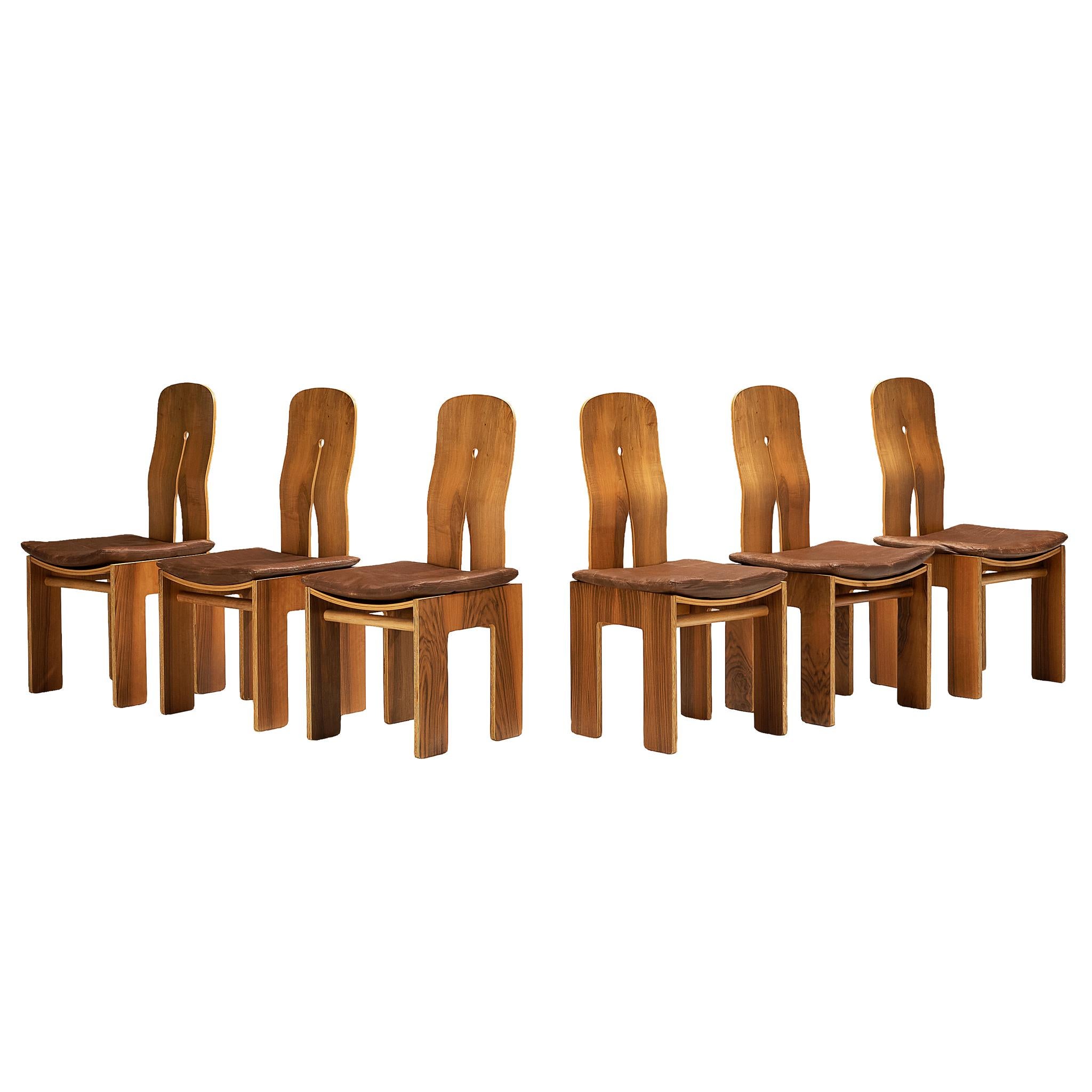 Carlo Scarpa for Bernini Set of Six Dining Chairs in Walnut and Brown Leather
