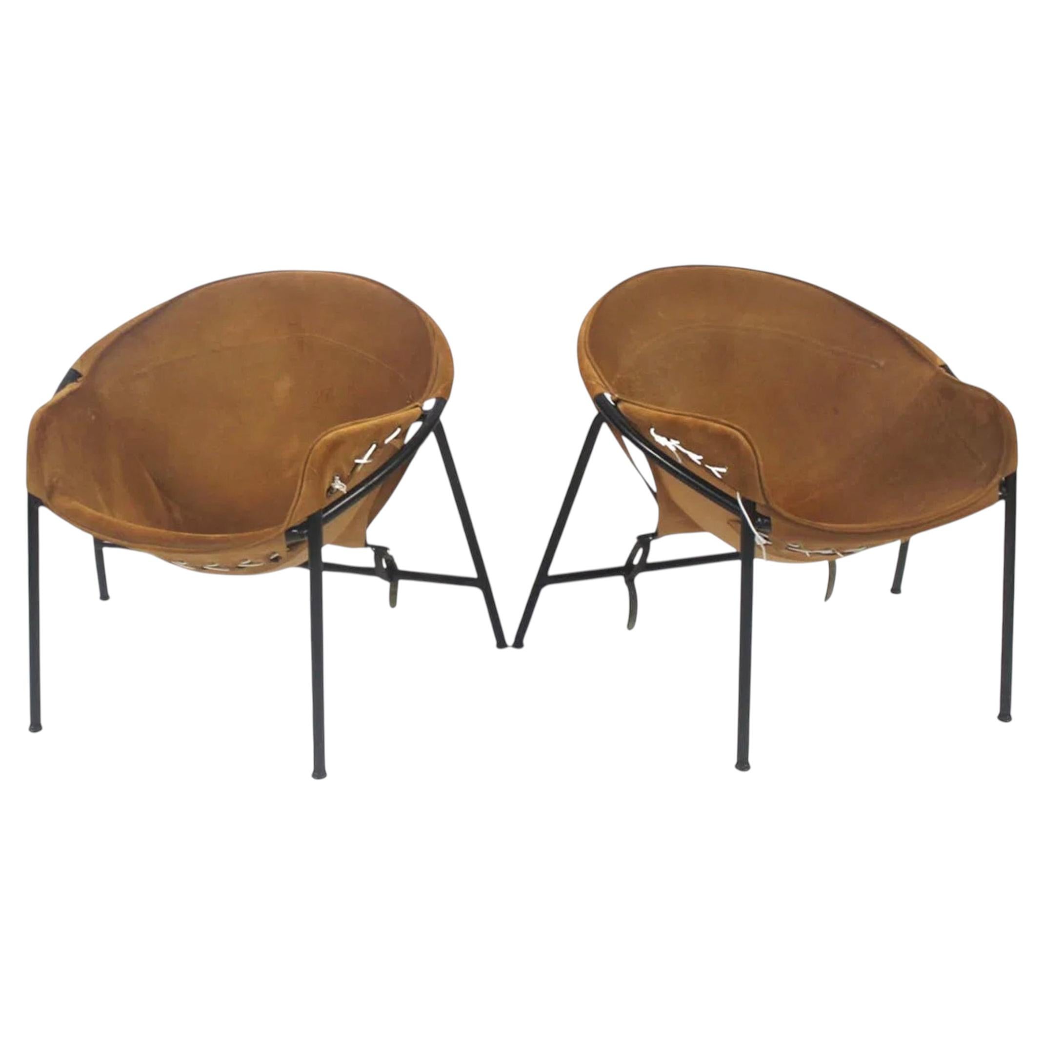 Very good overall condition. Frames appear to retain their original finish and have minor wear, scratches, scuffing as expected with age. Cognac suede slings are in very good condition with some minor wear along the seat rail. Shows extremely well.