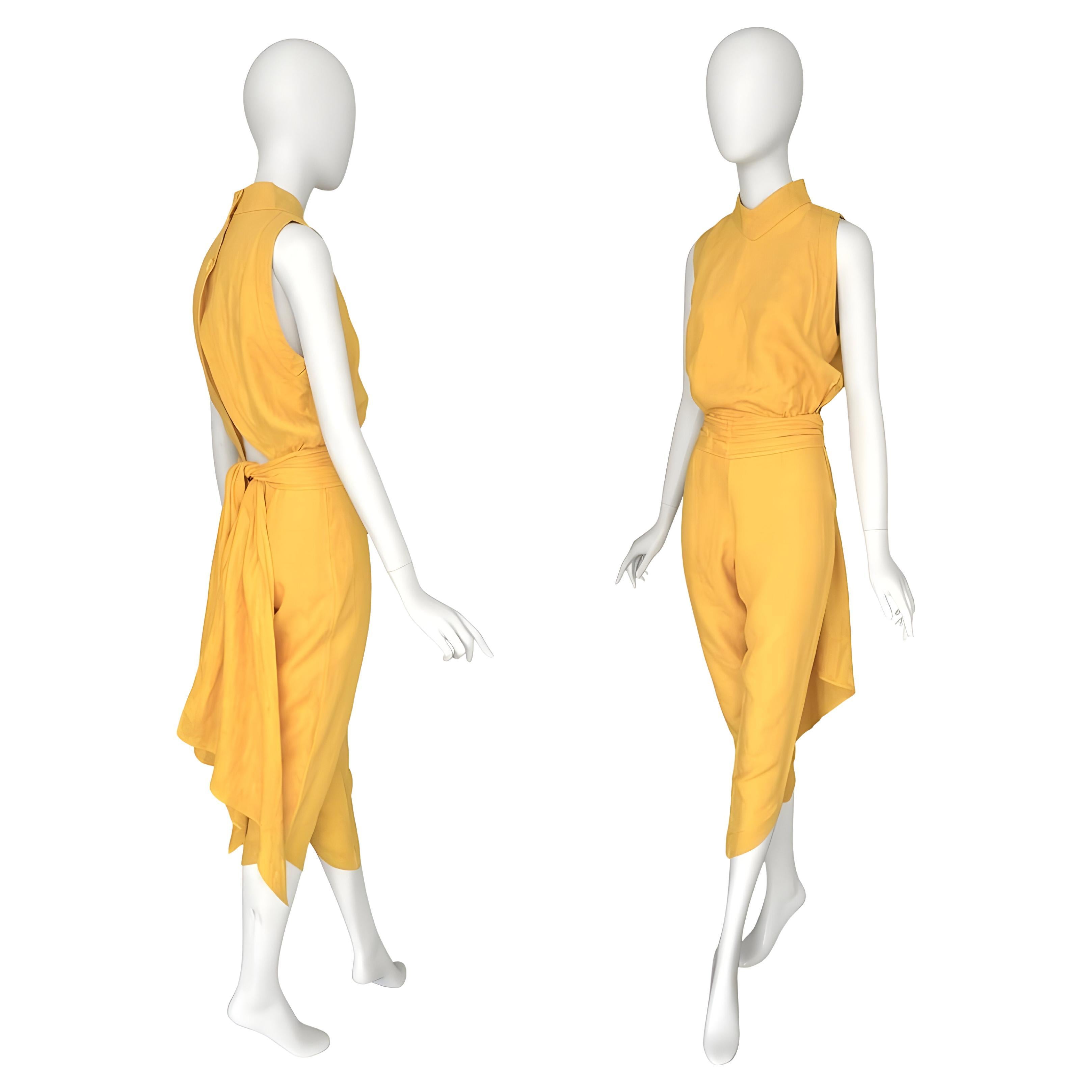 Exceptional vintage Byblos Designed by Alan Cleaver and Keith Varty linen jumpsuit in a vibrant golden-yellow tone. The sleeveless silhouette is complemented by a softly structured h...