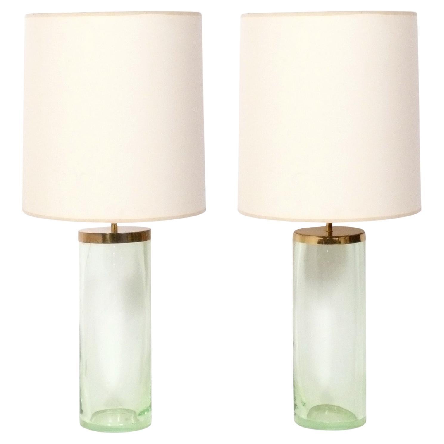 Elegant Pair of Thick Green Glass Cylinder Lamps, by Chapman, American, circa 1970s. We are unsure if Chapman or John Saladino originally designed these thick glass cylinder lamps, b...