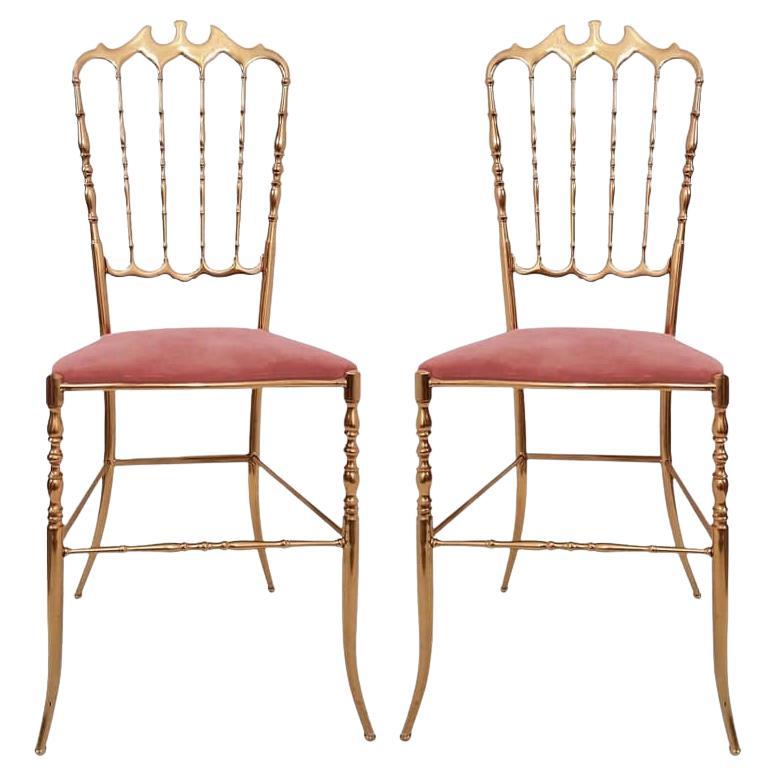 Set of 2 Italian Solid Brass Chiavari Chairs from 1950s Salmon Red Upholstery