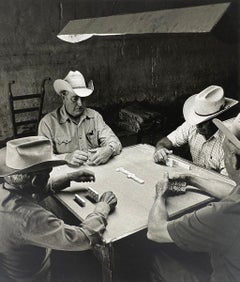 Domino Players, Lawn, TX by Chris Regas is a black and white gelatin silver print of four cowboys seated at a table, playing dominos.